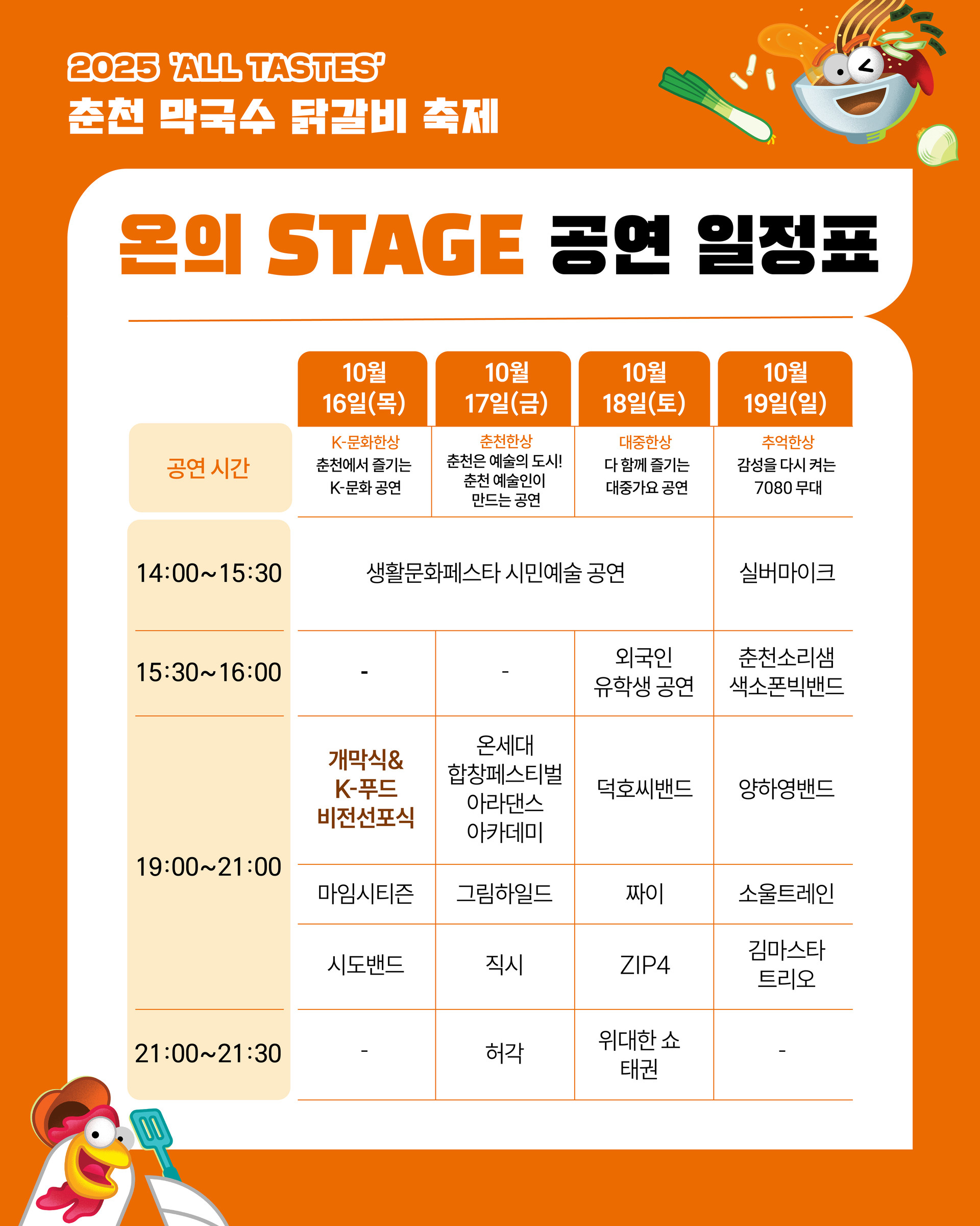 공연 무대: 전통 공연, 청소년 경연, 초청 가수 무대, 버스킹이 준비되어 있다. - 참여 이벤트: 막국수 빨리 먹기 대회와 닭갈비 양념 챌린지로 현장 참여가 활발하다.