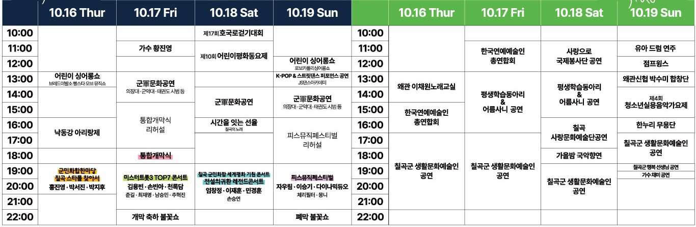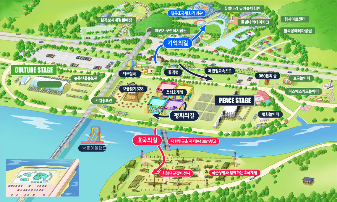 - 명칭 안내: ‘낙동강세계평화문화대축전’ 명칭이 ‘칠곡낙동강평화축제’로 사용됩니다.